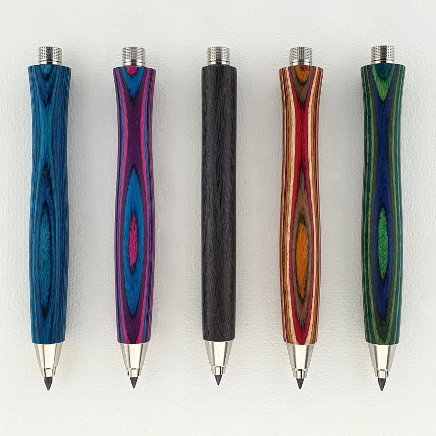 Die Stifte sind mit einem feinen Drechsleröl veredelt.Der Fallminenstift hat eine Graphitmine Ø 3,2mm, ca. 5B.